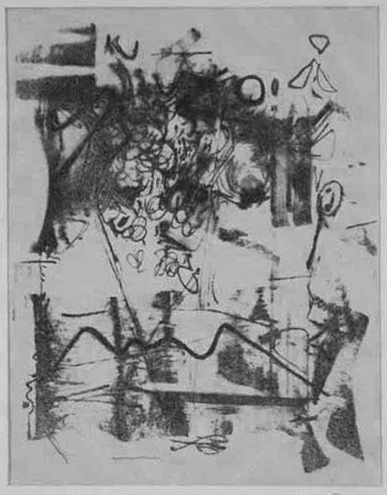 Ätzradierung, vernis mou,mit Textil und Roulette, Abdeckverfahren, Aussprengtechnik; auf Zinkplatte; Druck: einfarbig, schwarz, auf weißem oder getönten Papier- WV-Nr: D-oJ-2271