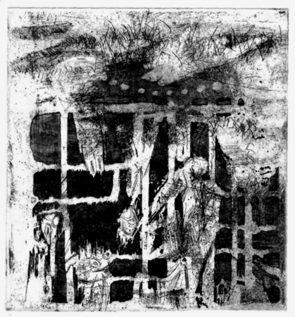 Weichgrundätzung,vernis mou, Aquatinta auf Zinkplatte; Druck: einfarbig, schwarz, auf weißem Bütten- WV-Nr: D-1959-2415
