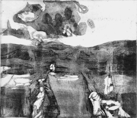 Ätzradierung, vernis mou, Aussprengtechnik, Aquatinta; auf Zinkplatte; Druck: einfarbig,schwarz, auf Bütten; (Mappe >Wege<, 12 Radierungen + Text von F.J. van der Grinten)- WV-Nr: D-1968-2489