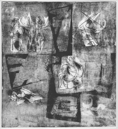 Ätzradierung, vernis mou mit Textil, Aquatinta; auf Zinkplatte; Druck: einfarbig, schwarz, auf weißem Papieoder chamoisfarbenem Velin- WV-Nr: D-1951-4061
