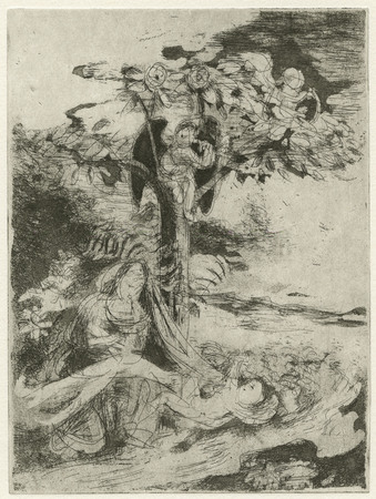 Ätzradierung, vernis mou, Aquatinta; auf Zinkplatte; Druck: einfarbig, schwarz, auf chamoisfarbenem Velin; weitere Betitelung: "Ruhe auf der Flucht nach Ph. O. Runge"- WV-Nr: D-1954-4065
