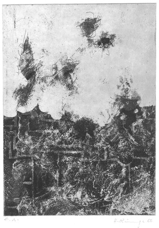 Ätzradierung und Weichgrundätzung (Vernis mou mit Textil); auf Zinkplatte; Druck: einfarbig, schwarz, teils auf weißem, teils auf chamoisfarbenem Bütten; weitere Betitelungen: "Hexentanz", "Garten mit Wesen"- WV-Nr: D-1963-4104