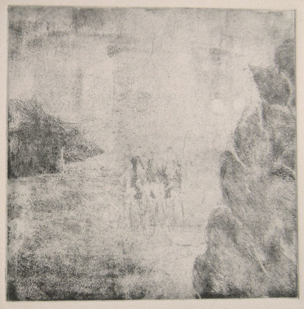 Ätzradierung, BS16; Druck: einfarbig, schwarz, auf chamoisfarbenem Velin, in 22 Bearbeitungsstufen (BS1-BS22); Motiv: Felsenlandschaft mit mittig eng zusammen stehender Menschengruppe- WV-Nr: D-oJ-4374