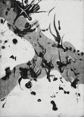 Ätzradierung; vernis mou mit Textil, Aussprengtechnik, Abdeckverfahren; auf Zinkplatte; Druck: einfarbig, schwarz, auf weißem und getöntem Papier- WV-Nr: D-1986-4467
