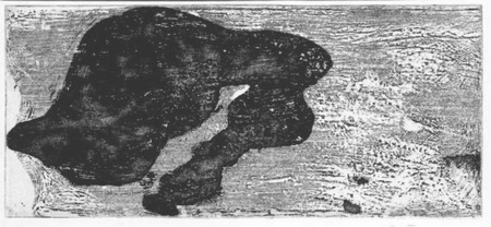 Ätzradierung, vernis mou, Aussprengtechnik, auf Zinkplatte; Druck: einfarbig, schwarz, auf weißem Papier