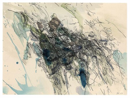 auf Aquarellpapier als Zeichnungsgrund: flüssiges Zeichnungsmittel: Aquarellfarben (helles und dunkleres Türkis), Tusche (schwarz)- WV-Nr: Z-1961-1913