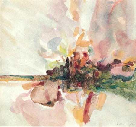 Titel: Mittags am TeichAquarell, Farbstift WV-Nr: Z-1964-1964 Gattung: Zeichnung Jahr: 1964 Maße: 19,5 x 21 Standort: Privatbesitz