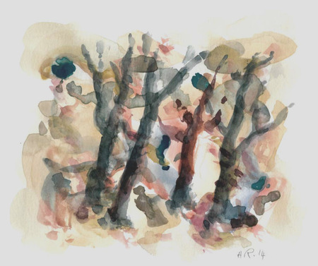 Pinselzeichnung; abstrakt, Baummotive; Gelb-, Rot-, Blau- Grautöne, auf weißem Aquarellkarton- WV-Nr: Z-2014-4613