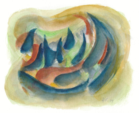 Pinselzeichnung; abstrakt; Landschafts-Motiv; Grundfarben in Tonabstufungen, voherrschend: blaue Gipfelchen; auf weißem Aquarellkarton- WV-Nr: Z-2014-4642