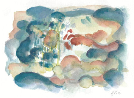 Pinselzeichnung; abstrakt; Landschaften-Motiv; Blautöne vorherrschend,Gelb-, Rot-, Grün-, Brauntöne; auf weißem Aquarellkarton- WV-Nr: Z-2014-4646