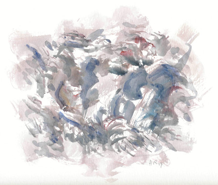 Pinselzeichnung; abstrakt; Meerestosen-Motiv; Blau-,Grautöne, etwas Rot; auf weißem Aquarellkarton- WV-Nr: Z-2014-4672