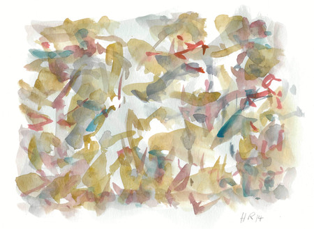 Pinselzeichnung; abstrakt; Gitter-Motiv; vorrangig: Ockertöne, Blau-, Rottöne; auf weißem Aquarellkarton- WV-Nr: Z-2014-4679