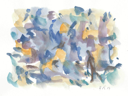 Pinselzeichnung; abstrakt; Blau-, Gelb-, Grün-, Lilatöne; auf weißem Aquarellpapier