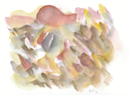 Pinselzeichnung; abstrakt; Landschafts-Motiv; Brau-, Oliv-, Grau-, Gelbtöne; auf weißem Aquarellkarton- WV-Nr: Z-2014-4748