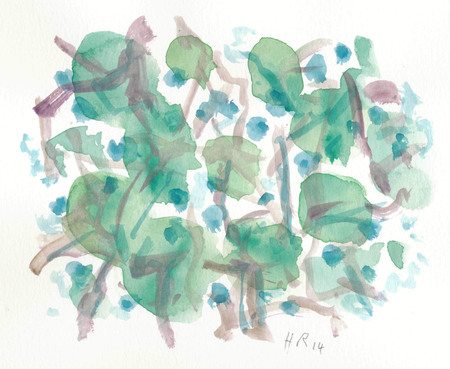Pinselzeichnung; abstrakt; Landschafts-Motiv; Grün-, Braun-, Blautöne; auf weißem Aquarellkarton- WV-Nr: Z-2014-4760