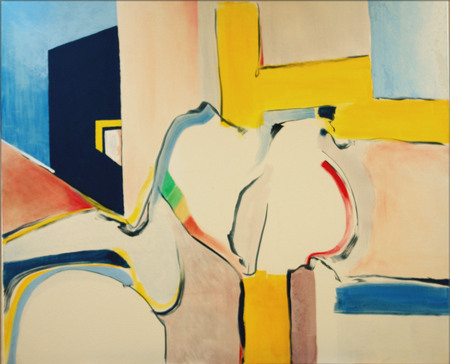 Acryl- + Ölfarben: gelb, dunkelblau, grün, rot, Beige-, Braun-, Blautöne; Malgrund Leinwand abstrakt: gelbe "Wege" führen zum Zentrum, dunkelblaue geometrische Fläche lins oben- WV-Nr: G-2004-1032