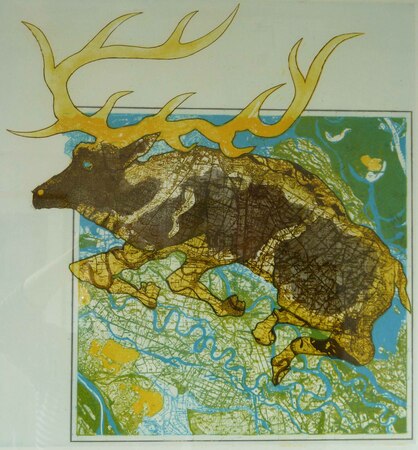Ätzradierung, vernis mou, Aquatinta; aus Bodenkarte NRW, 1: 50000, L 4307 Kleve, Hirsch herausgearbeitet; Mehrfarbdruck, auf weißem Kupferdruckbüttenpapier- WV-Nr: KD-1992-2104