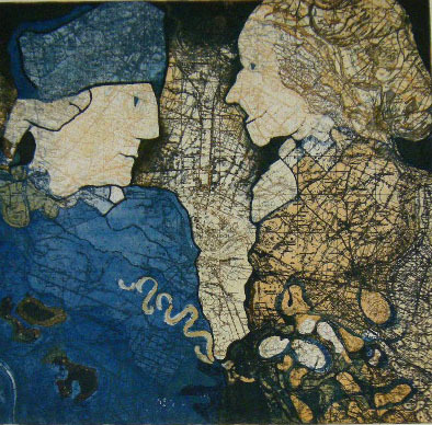 Ätzradierung, vernis mou, Aquatinta, Aussprengtechnik; aus Umgebungskarte Goch 2 Figuren heraugearbeitet; 2 Platten; Druck: zweifarbig, braun und blau, auf Hahnemühle Kupferdruckbütten- WV-Nr: KD-1992-3285