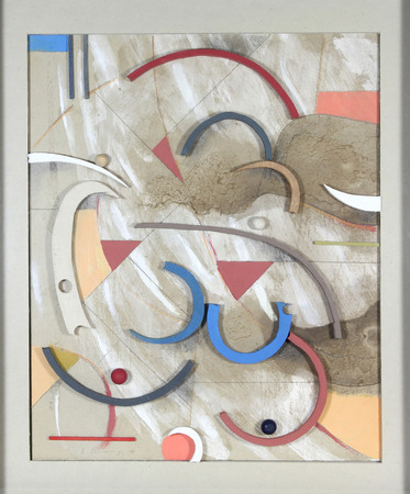 auf mit geometrischen Figuren (Bleistift), teilweise mit Acryl (weiß, grau, braun, orange, rosé) ausgemalt, versehene Graupappe als Bildträger und –teil: farbig gestaltete Holzabfälle du –kugeln; in Passepartout- WV-Nr: M-1994-1069