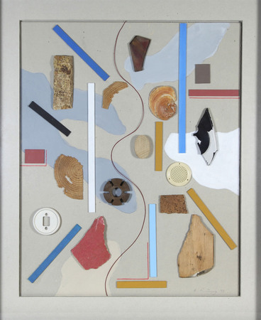 auf mit Acrylfarben bemalter Graupappe (blaugraue, beige, weiße „Zungen“ ragen von den Seiten zur Bildmitte): Kork, Muschel, Holz, Plastik, Faden, Kunststoff, Glaspapier, Eisenteil; in Passepartout- WV-Nr: M-1995-1075