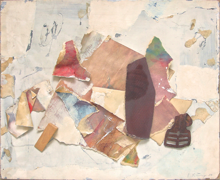 Pappe, bemalte Papierfetzen, weiße Farbe, Holzkeil, Gummigewebe, rostiges Eisen