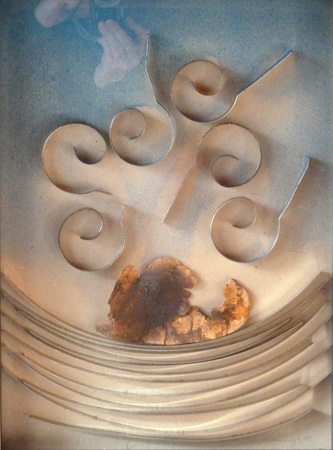 auf mit blauer Acrylfarbe (Himmel) besprühter Pappe: Metallbilderhalter, Metallfedern, Leder- WV-Nr: M-1985-172