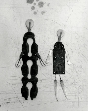 Graupappe als Bildgrund, geritzt und bekleckst, Stanzbleche, Messerklingen, Perlmuttgriffe, Klavierhämmer- WV-Nr: M-1987-297