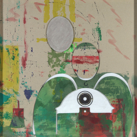auf Pappe, geschnitten und mit Acryl (Grundfarben) und schwarzer Tusche bemalt: Metallscheibe, Draht, Pappovale- WV-Nr: M-1989-303