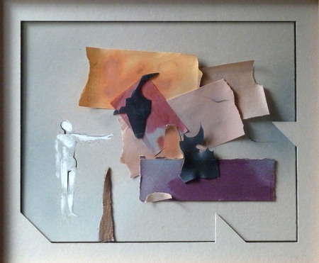 Graupappe, geschnitten und mit blauer Acrylfarbe besprüht, mit Acrylfarbe (lila, rot, schwarz, orange) bemalte und gerissene Papiere, Leder, Deckweiss (verweisende Figur)- WV-Nr: M-1990-444