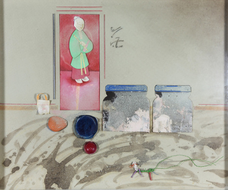auf Graupappe als Bildträger und -teil, geschnitten und bemalt: Spachtel, Draht, Stein, Farbnäpfe, Stoffigur- WV-Nr: M-1990-482