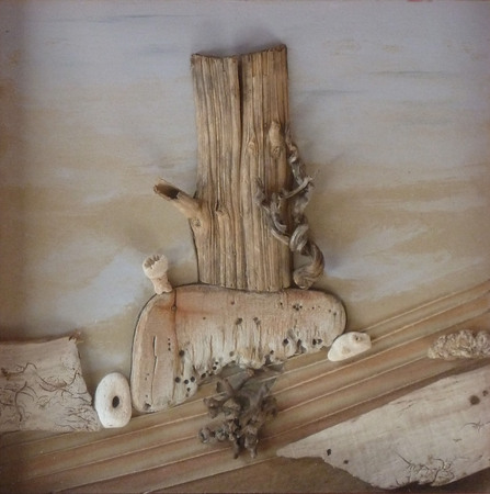 auf mit Acrylfarbe (Blau-, Weiß- und Brauntöne) bemalter Graupappe als Bildträger und -teil fixiert: Naturfundstücke: Fundholz, Steine, Koralle, Wurzeln, Kork, Acryl, Fäden- WV-Nr: M-1993-491