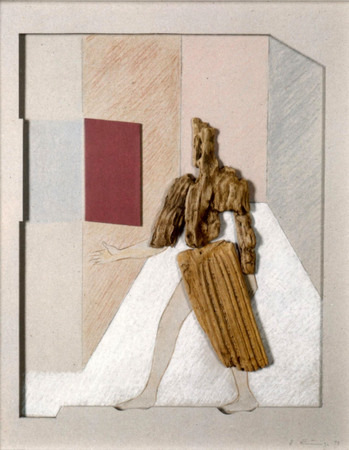 Graupappe (geschnitten und bemalt), Acryl-Farbe (bodeauxrot, weiß), Bleistift, Buntstift (blau, grau, rosa, braun), darauf: Fundholz, durch ergänzende Zeichung zu menschlicher, fast bildgroßer Gestalt abgerundet- WV-Nr: M-1993-499