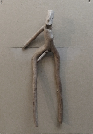 auf Graupappe als Bildträger aufgeschraubt: Astgabel (Körper), Bambus (Kopf), teilw. grau bemalt (Acryl)- WV-Nr: M-1994-571