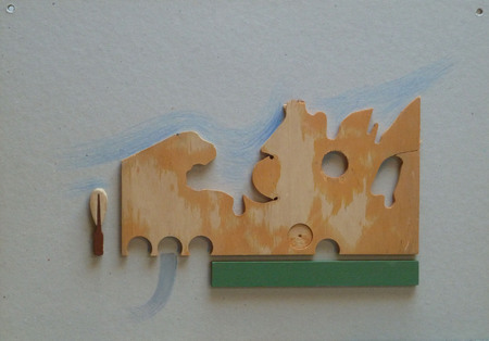 auf mit hellblauer Acrylfarbe (Himmel) bemalter Graupappe als Bildträger und -teil Sperrholzplattensägereste (Schloss), Klavierdämpfer (Baum), grüner Holzquader (Wiese)- WV-Nr: M-1994-587