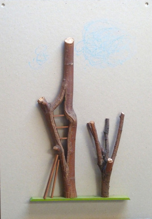 Graupappe als Bildträger u- -teil, darauf: mit hellgrüner Acrylfarbe bemaltes Holzbrettchen mit 2 Asthölzern und Holzstäben, blauer Farbstift zur Landschaftsgestaltung- WV-Nr: M-1994-604