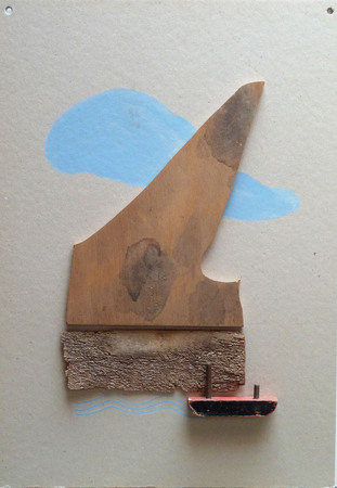 Graupappe als Bildträger u- -teil, darauf Holzfunde und -reste, 2 Schrauben, blaue Acrylfarbe für Wolke und Wasser (Motiv: Berglandschaft mit aufgelaufenem Schiff)- WV-Nr: M-1994-608