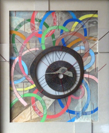 Graupappe mit in das Bild einbezogenem Passepartout als Bildträger und -teil, darauf zentral Schleifscheibe, Eisenring, davon ausgehend: rote Fäden, Transparentpapier, darumherum: bunter Bögen, gemalt (Acryl)- WV-Nr: M-1998-895