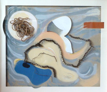 Titel: SchwemmlandHolz, Pappplatte eingesÃĪgt + bemalt, Fahrradkette, Acryl WV-Nr: M-2001-981 Gattung: Materialbild Jahr: 2001 Maße: 80 x 70 x 5 Standort: HR