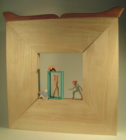 Thema: naturalist. plast. Fig. auf Fundstücken Holz (breiter Rahmen, pur; kleiner Rahmen, türkisfarben bemalt), Formmasse (4 modellierte Figuren, davon 1 nackte weibliche im kleinen Rahmen und 1 Harlekin), Acryl-Farben: türkis, orange, rot, blau, grau- WV-Nr: O-2003-1804
