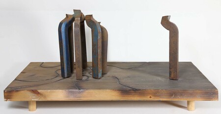 auf gefirnisster Holzbohle mit Füsschen als Objektträger u. -teil: 6 zueinander gefügte, stehende Eisenfiguren (rostig, blaue Farbe teilweise noch durchschimmernd), 1 Eisenfigur steht entfernt, außerhalb der Gruppe- WV-Nr: O-1979-1839