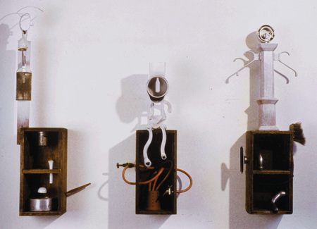 braunes Holzregal mit Pozellan- u. Küchengeräten; seitlich angebracht: Leiste mit zur Fee gestalteten 1/2 Teeei und Reibe (Objekt 1 der Trilogie Küchenfee - Kellermeister - Kammerzofe)- WV-Nr: O-1981-67