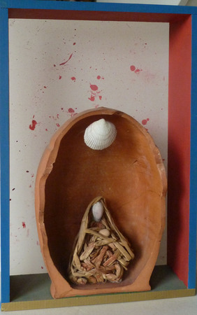in blau-rot gestrichenem Holzrahmen: Tonbackform mit Muschel (heiliger Geist), Schilfrohr und Stein zu Maria mit Kind gestaltet (Weihnachtskrippe)- WV-Nr: O-1982-104