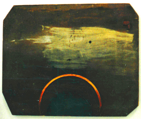 dunkelbraune Holzplatte mit halbem, rot u. gelb bemalten Eisenring (Sonnenkorona) im unteren Objektdrittel, darĂ¼ber mit beigen Acrylfarben gestalteter Himmel- WV-Nr: O-1983-126