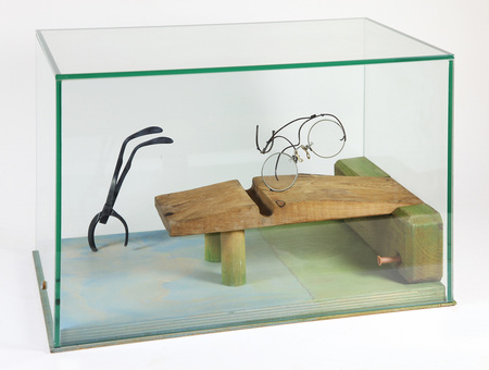 auf mit grüner und blauer Acrylfarbe lasierter Schichtholzplatte als Objektträger und -teil: 2 Holzsäulen, 1 Holzquader (grün lasiert), 1 Formholz, 2 Brillengestelle (Fahrrad und Stürzender), unter Glaskasten- WV-Nr: O-1985-186