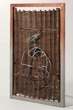 in offenem rötlichen Holzrahmen (unterer Teil mit grauer Acrylfarbe übermalt): Rohrgeflecht, darauf: rostiger Draht teils mit weißer Acrylfarbe bemalt- WV-Nr: O-1986-222