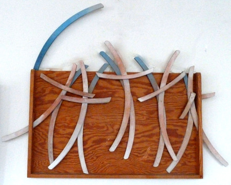 auf braunem Holztablett: 10 Holzkleiderbügel paarweise "tanzend" geordnet, hellblau und rosa bemalt, blauer Kleiderbügel ragt aus linker oberer Ecke nach rechts- WV-Nr: O-1987-276