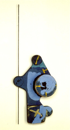 Holzgussform bemalt, Acryl-Farbe (hell- und dunkelblau, gelb), Eisenstange- WV-Nr: O-1989-383