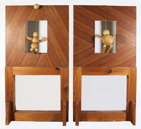 auf 2 identischen, zum Objekt gehörenden Holzgestellen: 2 Pressholzplatten mit unterschiedlicher Maserung, in den daraus jeweils ausgesägten Rechtecken aufgehängt: 2 bewegliche Marionetten aus Holzkugeln und -stäben- WV-Nr: O-1979-672