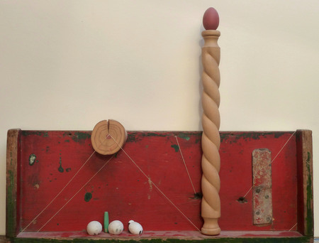 Gedrechselter Stab, Holzeier, Faden, Schnittholz, auf rotem Brett, grĂ¼n gefasst
