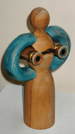 Titel: BinocleOpernglas, Holzfigur, Messing WV-Nr: O-1997-885 Gattung: Objekt Jahr: 1997 Maße: 26 x 16 x 7 Technik: Materialmontage Standort: Privatbesitz
